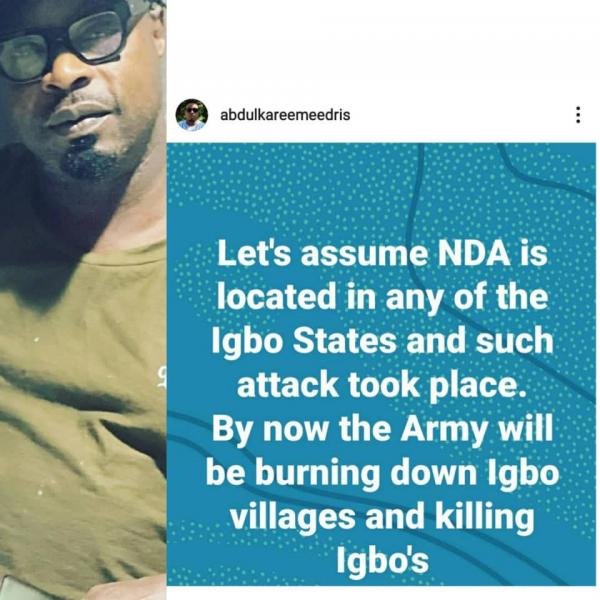 Assuming the Nigeria Defense Academy was in any of the Igbo states, by now Army will be burning down Igbo villages - Singer, Eedris Abdulkareem | View | |